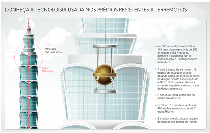 Uma das partes mais importantes dos prédios com tecnologias mais modernas contra terremotos é o sistema de contrapeso inercial: instalada na parte mais alta, uma bola pesada o bastante para movimentar o prédio no sentido contrário às vibrações do solo atenua o movimento e permite que o prédio se mantenha 40% mais estável durante um terremoto.