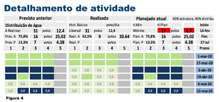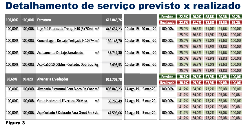 Na Figura 3 é possível verificar que muitas informações essenciais são disponibilizadas na plataforma para o acompanhamento da obra, tais como detalhamento das atividades que compõem os serviços, detalhamento por atividade com prazo inicial e final, cronologia do percentual a ser realizado mês a mês e custos por atividade, por exemplo. Essas reuniões geram planilhas de controle, que mostram a situação das metas previstas para o mês anterior e as projeções para o próximo mês (Figura 4).