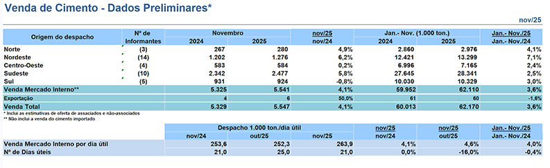 As vendas de cimento em novembro totalizaram 5,5 milhões de toneladas, o que representa uma alta de 4,1% em relação ao mesmo mês de 2024, segundo o Sindicato Nacional da Indústria do Cimento (SNIC).