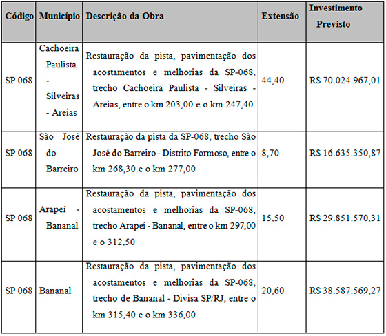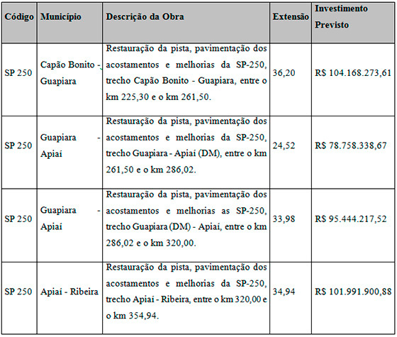 Serão ao todo, 13 trechos de obras, totalizando 404,6 quilômetros de rodovias modernizadas e investimento superior a R$ 1 bilhão. Para que o recurso do BID fosse liberado, o DER realizou antes audiências públicas em vários municípios beneficiados, para que as necessidades e opiniões da população local fossem ouvidas. Com a aprovação dos projetos executivos, agora as obras poderão ser licitadas.