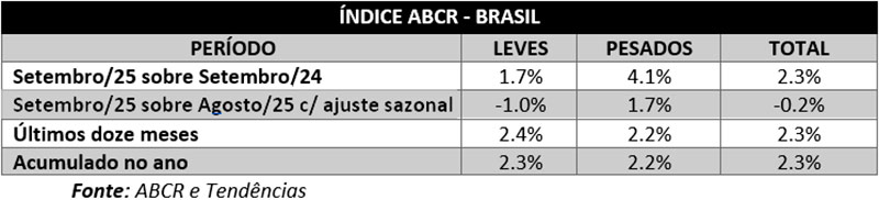 Na comparação com setembro de 2024, o índice total caiu 0,6%, resultado da queda de 1,1% nos veículos leves, superando a alta de 1,8% dos pesados.