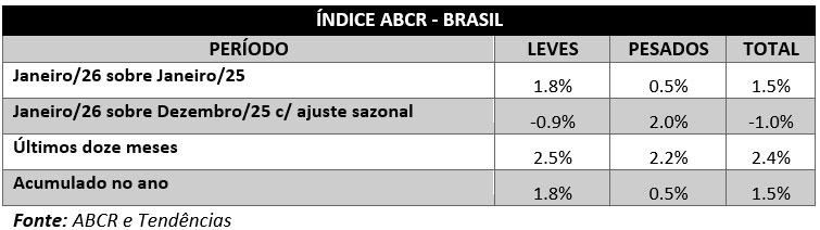 O Índice ABCR referente a janeiro de 2026 caiu 1,0% na comparação dessazonalizada com dezembro. O índice que mede o fluxo pedagiado de veículos nas estradas é construído pela Associação Brasileira de Concessionárias de Rodovias juntamente com a Tendências Consultoria.