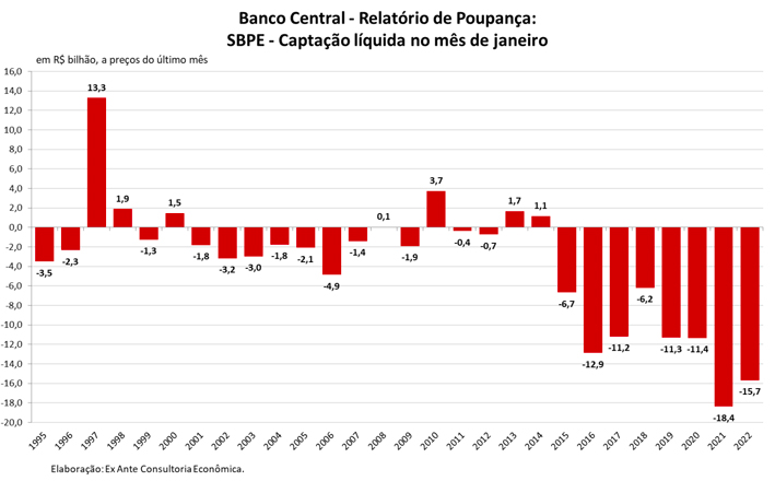 A captação líquida do sistema voltou a ser negativa em janeiro, em R$ 15,678 bilhões, em linha com o padrão histórico de resultados negativos para o mês, como ilustra o gráfico a seguir, que apresenta a série histórica do Banco Central do Brasil iniciada em 1995, a preços constantes do último mês, para as captações registradas no mês de janeiro. A concentração de despesas específicas no início do ano é determinante para esse padrão, como alguns impostos (IPTU e IPVA), por exemplo. Quanto à magnitude da captação líquida no último mês de janeiro, ela não superou o valor registrado no mesmo mês de 2021, ainda que tenha sido mais expressiva do que o registrado entre 2015 e 2020, cuja média ficou pouco abaixo de R$ 10 bilhões negativos, sempre considerando as informações ajustadas pela inflação do período.