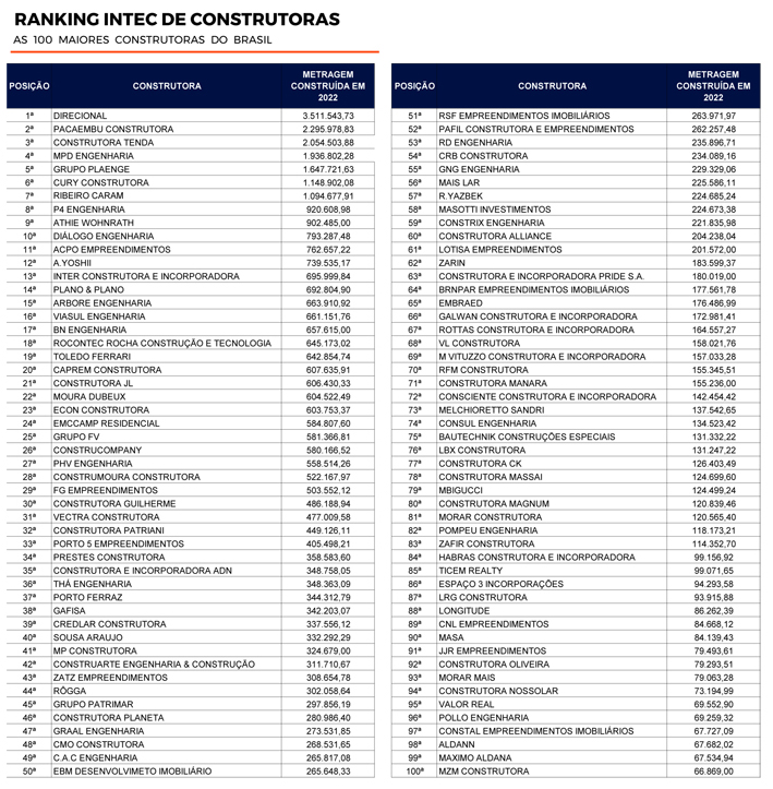 O Ranking Intec das Maiores Construtoras do Brasil visa apresentar e homenagear as empresas que se destacaram no ano anterior. Encabeçam a lista do Top 100 desta edição Direcional, Pacaembu Construtora e Construtora Tenda.